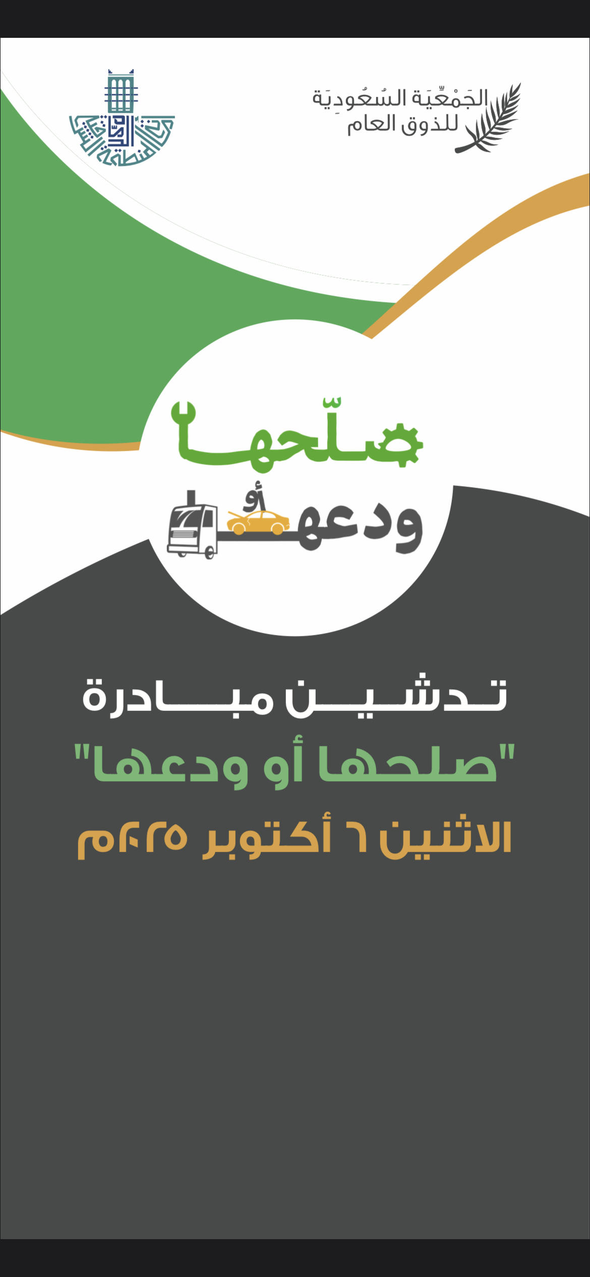 تطلق الجمعية السعودية للذوق العام وأمانة المنطقة الشرقية مبادرة “صلحها أو ودعها”، التي تساهم في تحسين المشهد الحضري في المدن، ورفع الوعي المجتمعي حول أثر المركبات التالفة والمهملة، والتخلص من مناظر التشوه البصري في الأحياء السكنية.