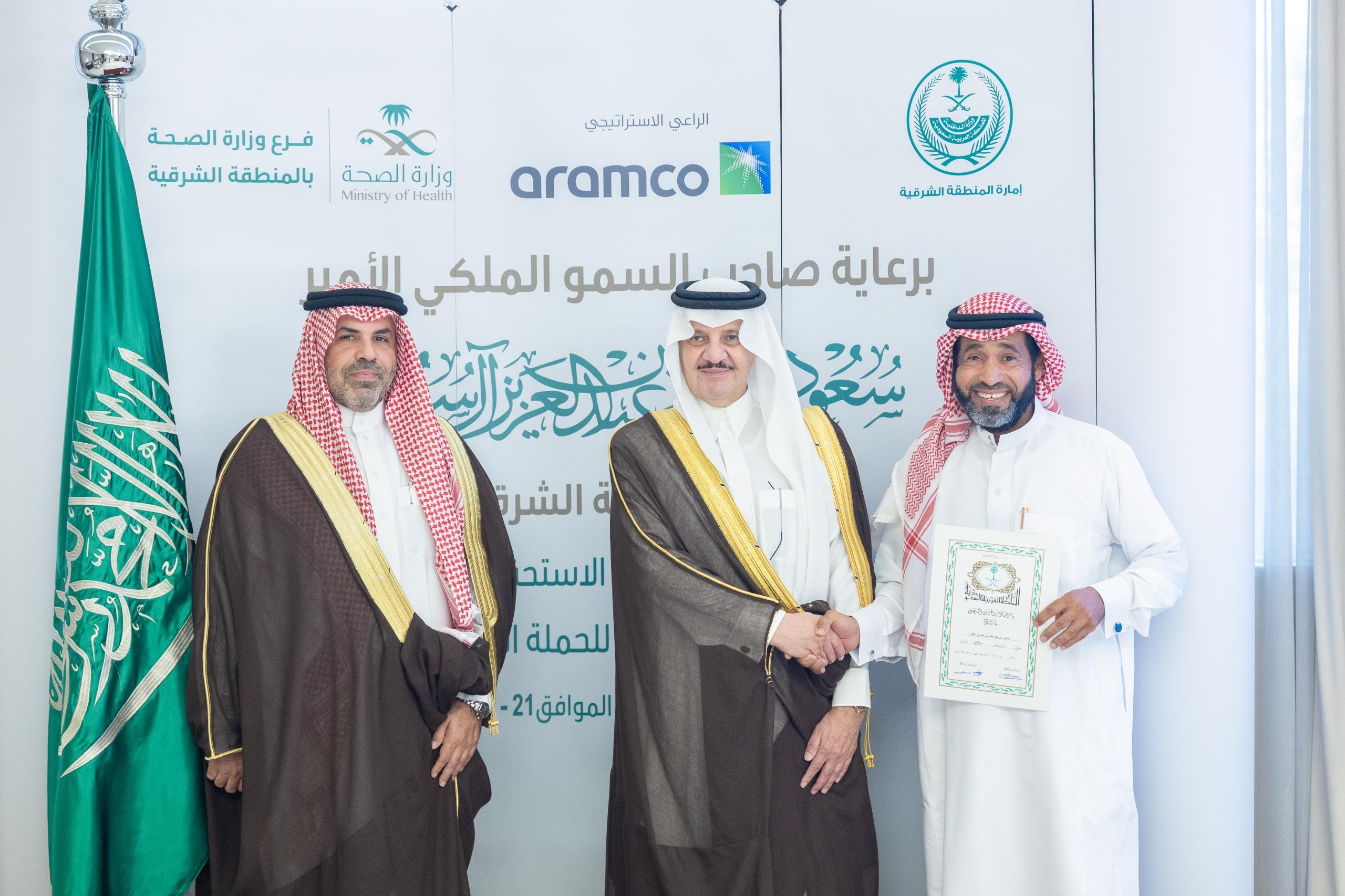 وفي ختام الحفل، كرم سمو أمير المنطقة الشرقية 25 متبرعًا تبرعوا بأكثر من 50 مرة، تقديرًا لعطائهم الإنساني ومساهمتهم في إنقاذ الأرواح، كما كرم سموه الجهات المشاركة والداعمة للحملة نظير جهودها في إنجاح فعالياتها وتحقيق أهدافها الإنسانية .