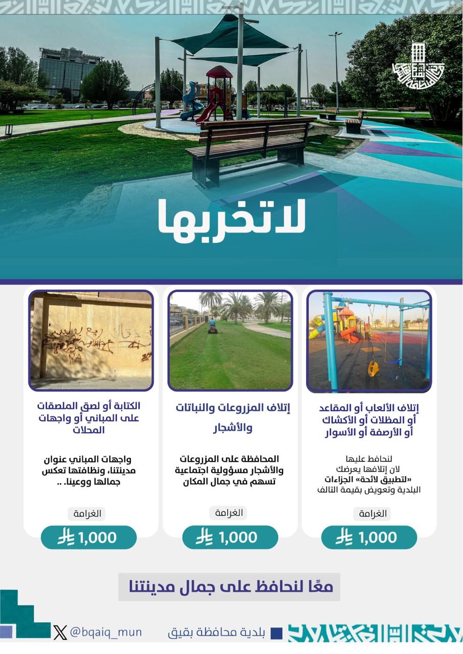 من جانبه نوه رئيس بلدية محافظة بقيق، المهندس محمد بن عفتان الظفيري، إلى أن هذه المبادرة تأتي ضمن جهود البلدية المستمرة لتعزيز الثقافة المجتمعية وتحفيز جميع فئات المجتمع على المشاركة الفاعلة في الحفاظ على المرافق العامة، مشيرًا إلى أن المبادرات المجتمعية مثل #لا_تخربها تعكس روح المسؤولية والاستدامة البيئية في المحافظة.