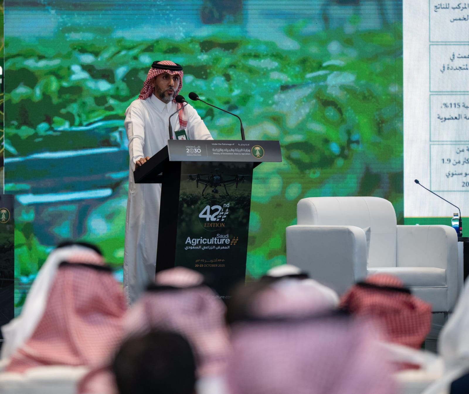 وأبان، أن الوزارة أطلقت 38 مبادرة وطنية رائدة، ضمن الإستراتيجية الوطنية للزراعة، شملت 11 مبادرة لتحسين وتعزيز الإنتاجية الزراعية، و5 مبادرات لهيكلة القطاع وبناء قدراته، و5 مبادرات لدعم برامج التنمية الريفية الزراعية المستدامة، و5 مبادرات لتعزيز الوقاية الفعّالة للنبات والحيوان وفق نهج الصحة الواحدة، و4 مبادرات لتوطين وتطوير نظم غذائية مرنة ومستدامة لتعزيز الأمن الغذائي، و3 مبادرات لتعزيز استدامة الموارد الطبيعية والتكيف مع التغير المناخي، و3 مبادرات لتطوير التسويق والخدمات الزراعية، ومبادرتان لحماية المنتجات المحلية وتعزيز الصادرات، مبينًا أن القطاع الزراعي حقق تقدمًا ملحوظًا ومنجزاتٍ كبيرة في العديد من مؤشرات الإنتاج الزراعي، إذ تجاوز معدل النمو السنوي المركب للناتج المحلي خلال السنوات الخمس الماضية 7%، كما أسهم تطبيق أنظمة الري الفعالة في خفض استخدام المياه غير المجدّدة في الزراعة بنسبة 52% مقارنة بعام 2016، فيما ارتفع إجمالي القروض الزراعية الميسرة المقدمة من قبل صندوق التنمية الزراعية بأكثر من 1,9 مليار دولار.