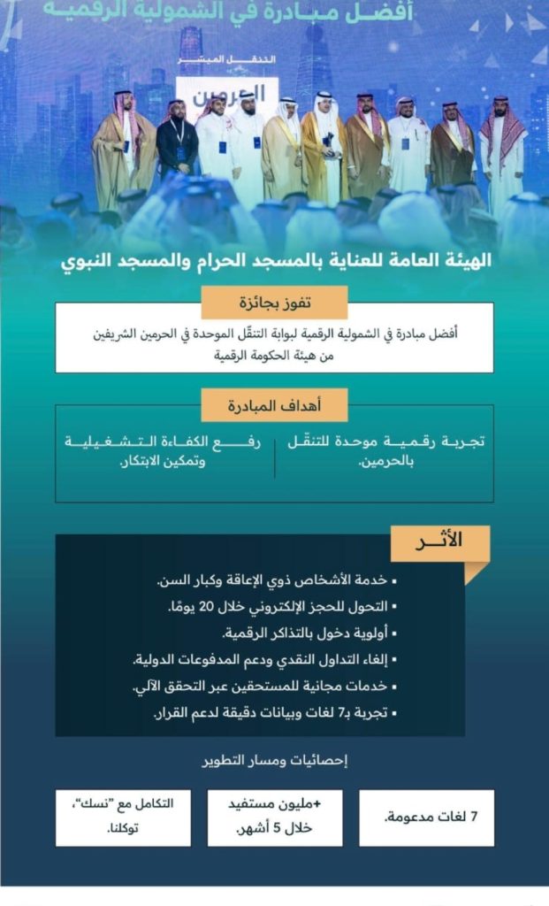 فوز “بوابة التنقّل الموحدة في الحرمين الشريفين” بجائزة أفضل مبادرة في الشمولية الرقمية من هيئة الحكومة الرقمية”