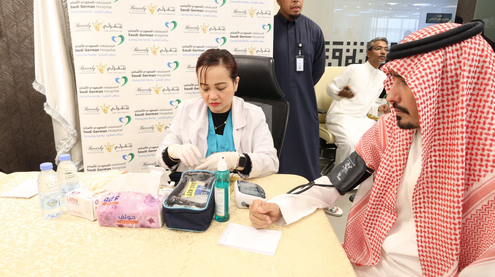 كما تضمنت تقديم خدمات طبية تشمل: طب الأسرة، العيون، العلاج الطبيعي، قياس الضغط والسكر، قياس كتلة الجسم.