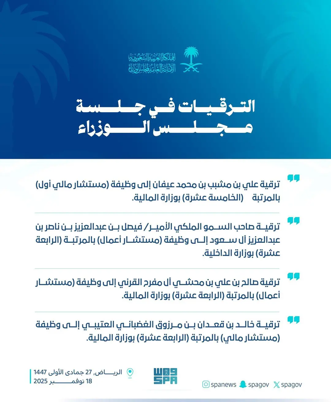 – ترقية صاحب السمو الملكي الأمير/ فيصل بن عبدالعزيز بن ناصر بن عبدالعزيز آل سعود إلى وظيفة (مستشار أعمال) بالمرتبة (الرابعة عشرة) بوزارة الداخلية.