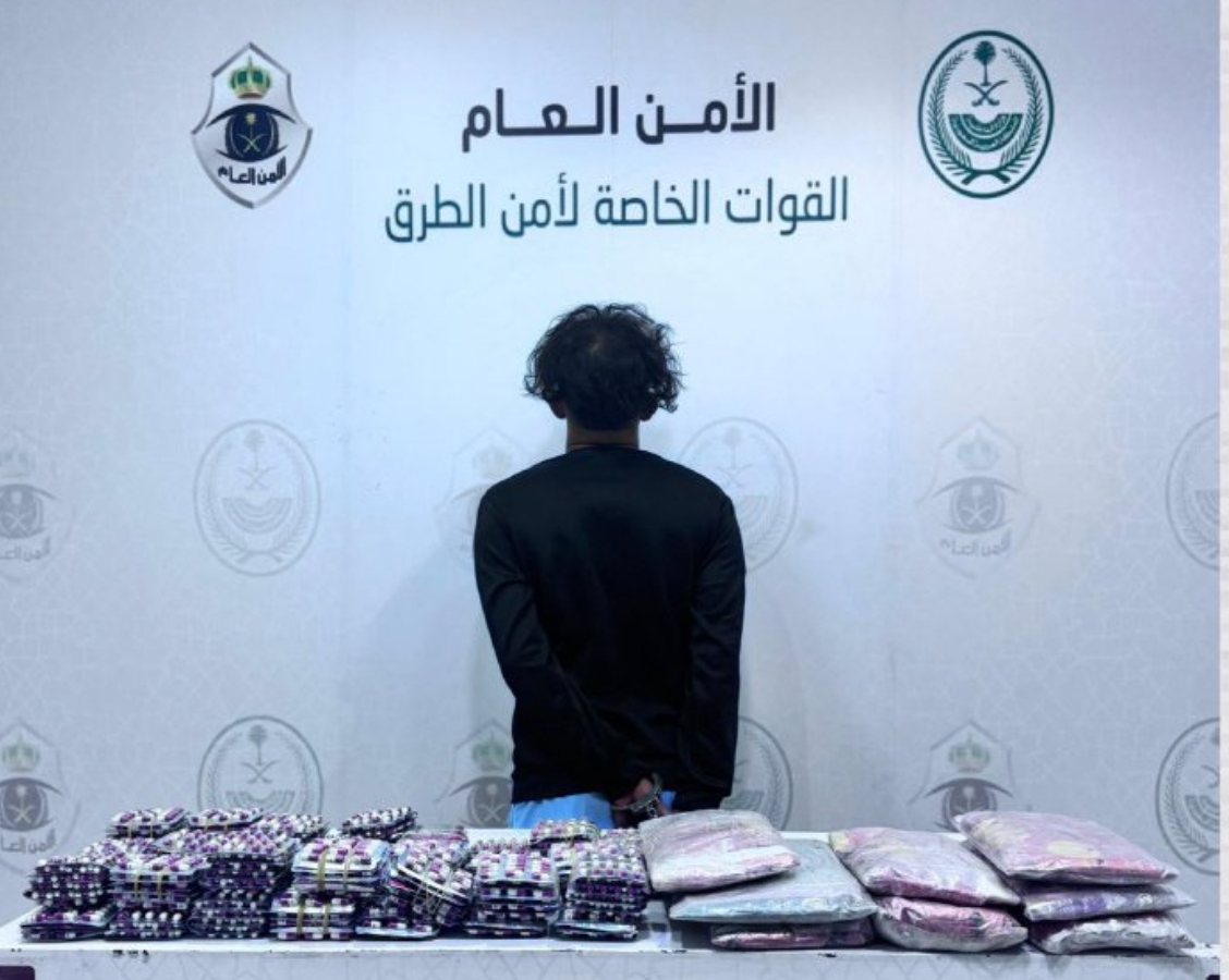 القوة الخاصة لأمن الطرق بمنطقة مكة المكرمة تقبض على شخص لترويجه (8) كيلوجرامًا من مادة الحشيش المخدر و(5700) قرص خاضع لتنظيم التداول الطبي مخبأة داخل مركبته
