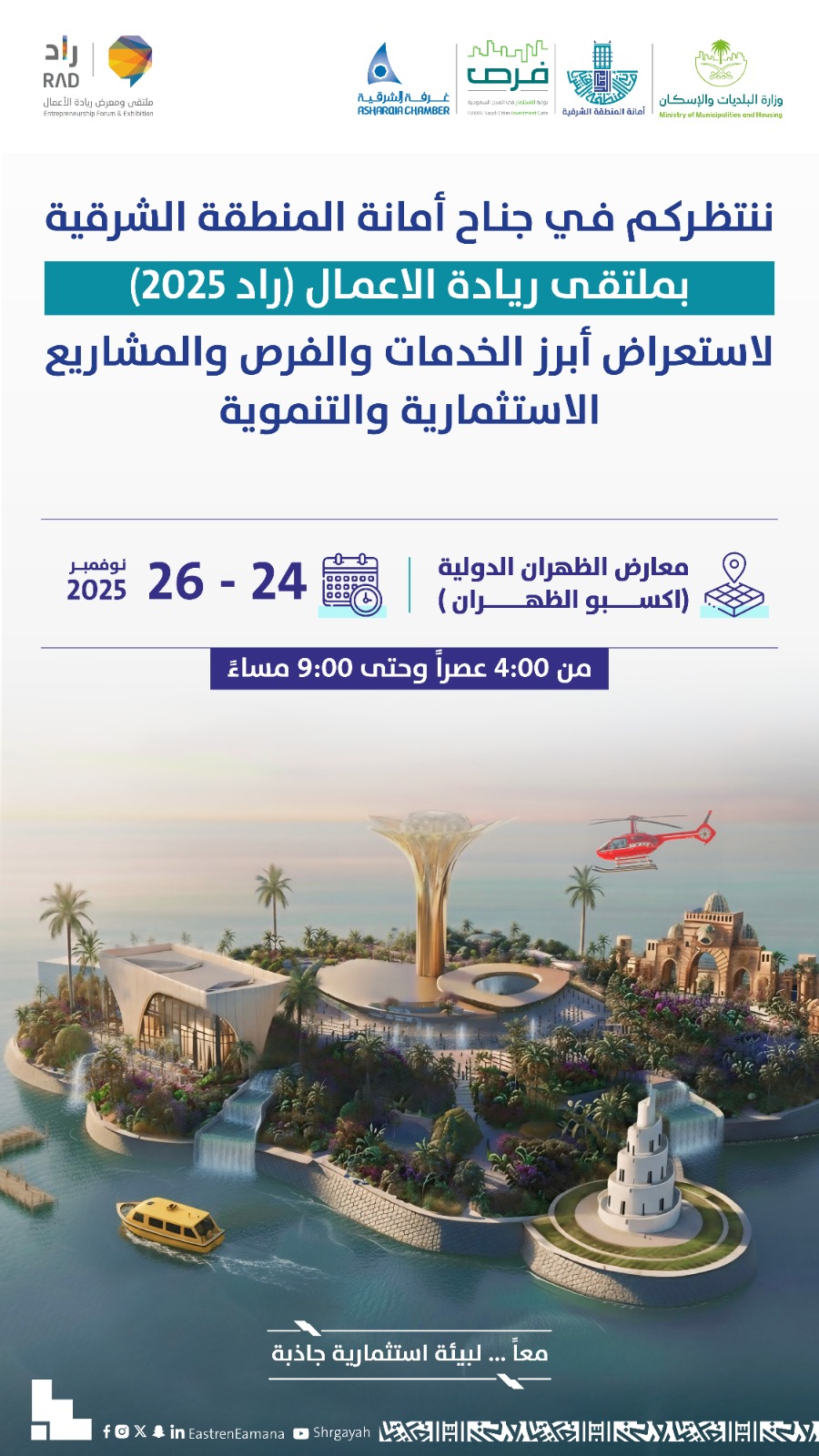 وينطلق ملتقى ومعرض “راد 2025” تحت مظلة غرفة الشرقية، بهدف توفير منصة متكاملة تجمع المستثمرين والممولين والمطورين العقاريين، وإتاحة الفرصة للمهندسين المعماريين وخبراء التخطيط العمراني والاستشاريين وممثلي وكالات الاستثمار والمدن والمشاريع العمرانية، لمناقشة ومتابعة آخر التطورات في القطاع العقاري وإقامة شراكات جديدة على الأصعدة المحلية والإقليمية والعالمية.
