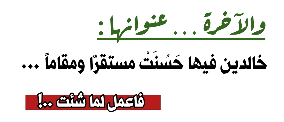ولذلك قال السلف : “اعمل للدنيا بقدر بقائك فيها، واعمل للآخرة بقدر بقائك فيها.”فمن قَصُر عمله قصُر مقامه، ومن أخلص طال عطاؤه، وارتفع ذكره، ودام نعيمه. فالعمل الصالح هو الباقي، والدنيا وسيلة وليست غاية، والآخرة دار الثبات والجزاء.