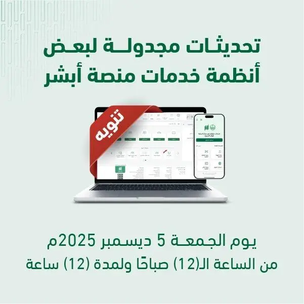أعلنت منصة وزارة الداخلية الإلكترونية “أبشر” عن إجراء تحديثات لبعض أنظمة خدماتها يوم الجمعة المقبل (5 ديسمبر 2025م) بدءًا من الساعة الـ(12) صباحًا حتى الساعة الـ(12) ظهرًا، وذلك في إطار عملياتها المجدولة لتوفير تجربة مستخدم متميزة تتيح سهولة وسرعة الوصول إلى الخدمات بكفاءة عالية.