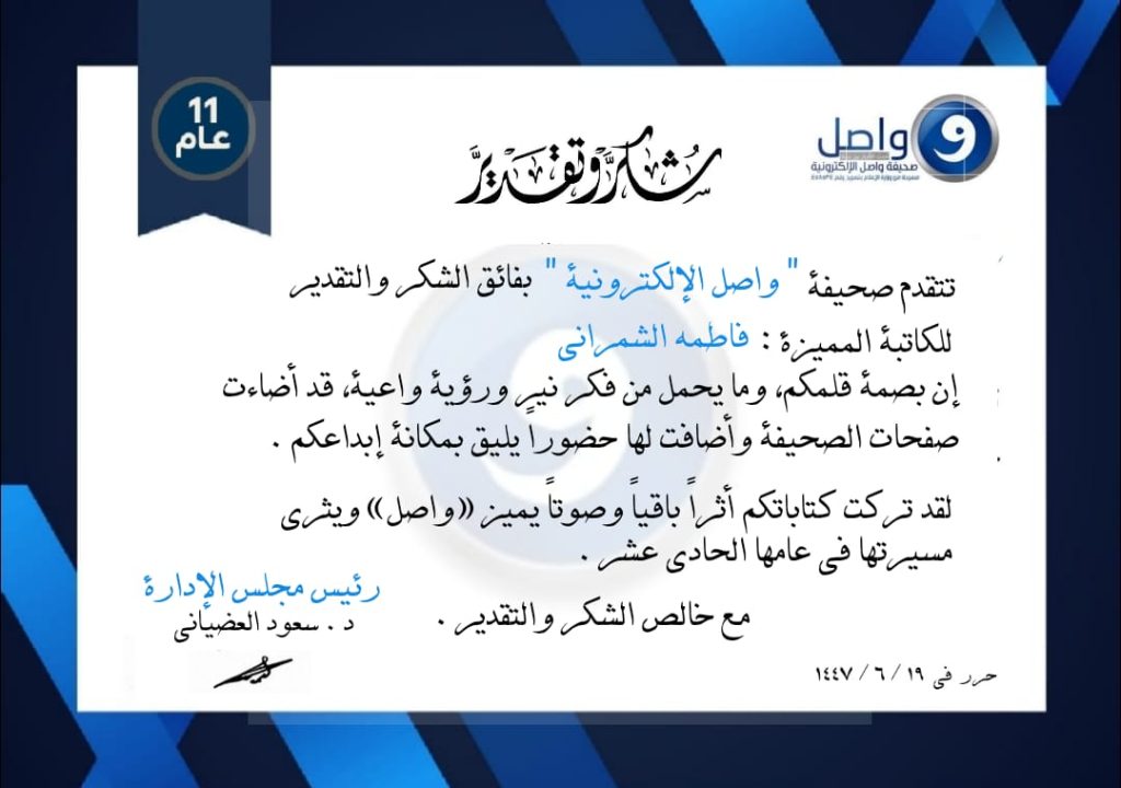 وتواصل صحيفة «واصل الإلكترونية» مسيرتها في عامها الحادي عشر بقيادة الدكتور: سعود العضياني، مستندةً إلى إرثٍ من العطاء، وشراكة حقيقية مع كُتابها، إيماناً بأن الإعلام رسالة، وأن الكلمة الصادقة هي أساس التأثير والبقاء.