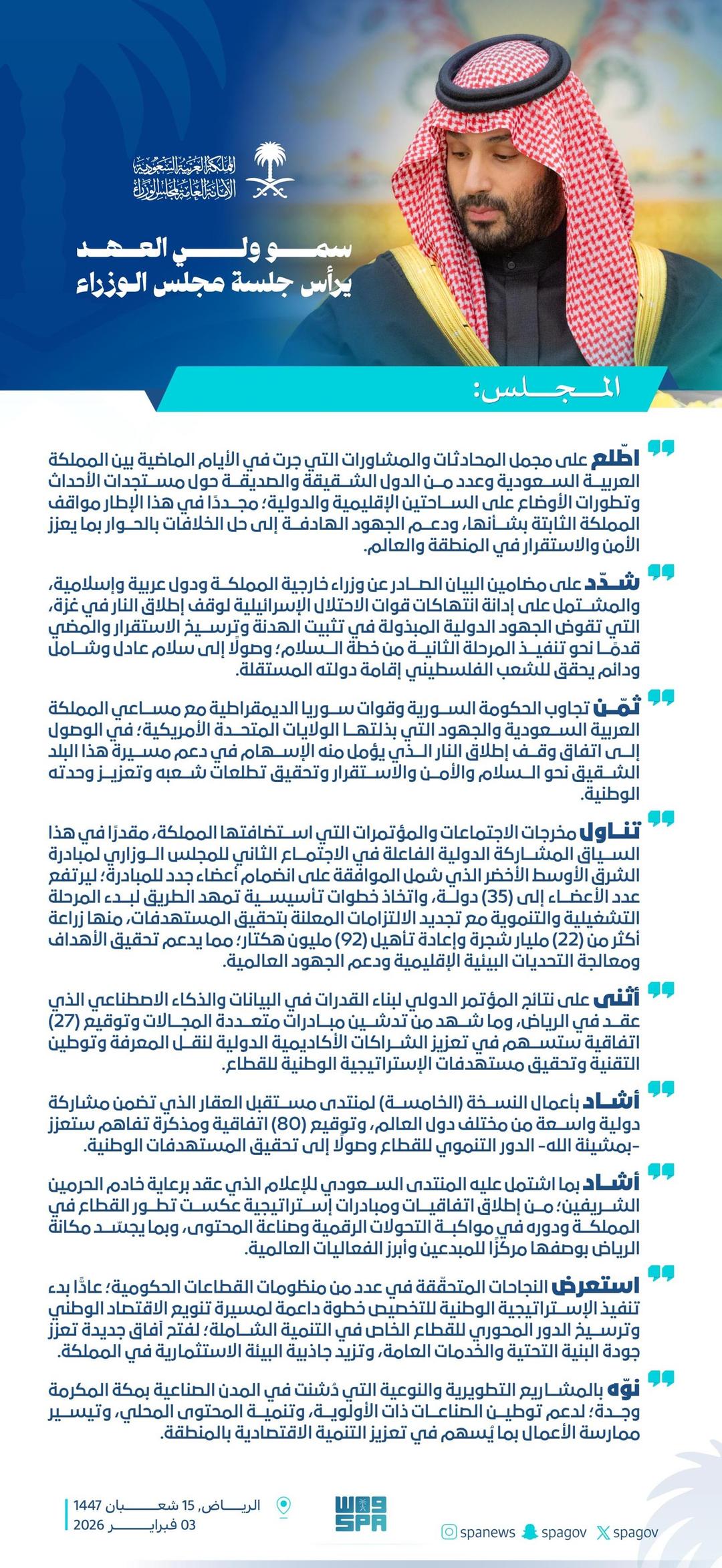 وأشاد المجلس بما اشتمل عليه المنتدى السعودي للإعلام الذي عقد برعاية خادم الحرمين الشريفين الملك سلمان بن عبدالعزيز آل سعود -حفظه الله-؛ من إطلاق اتفاقيات ومبادرات إستراتيجية عكست تطور القطاع في المملكة ودوره في مواكبة التحولات الرقمية وصناعة المحتوى، وبما يجسّد مكانة الرياض بوصفها مركزًا للمبدعين وأبرز الفعاليات العالمية.