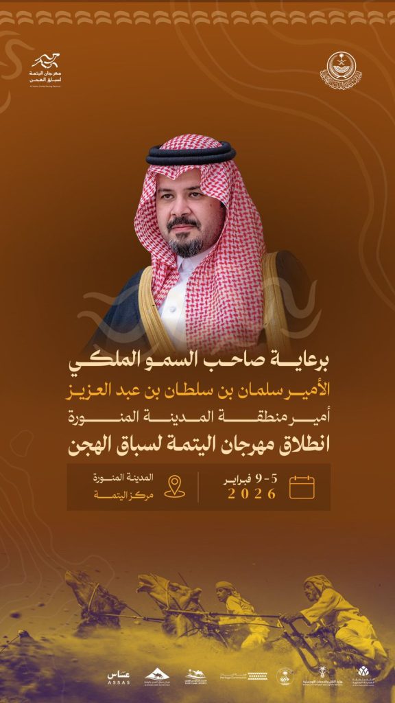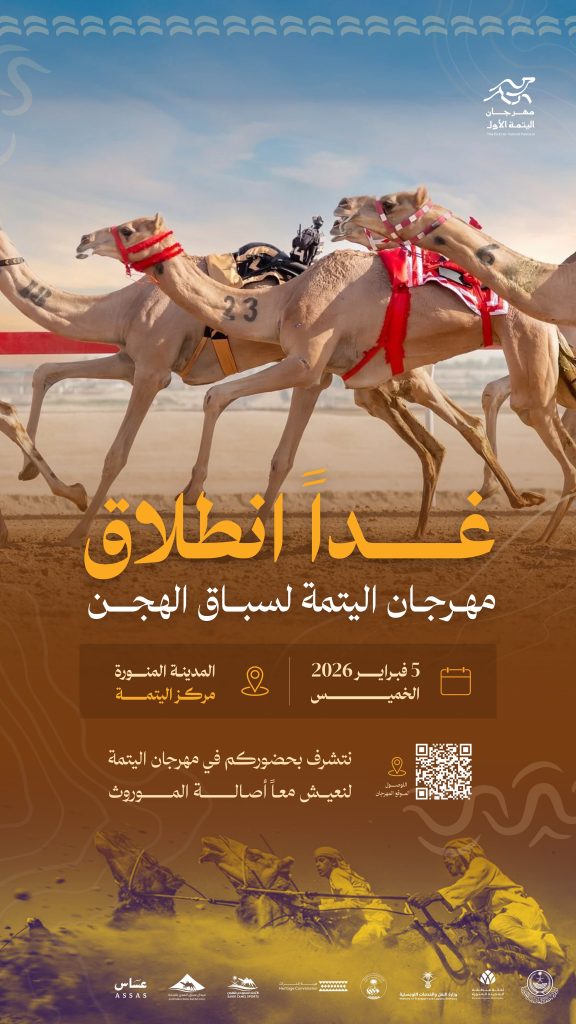 تنطلق غدًا الخميس فعاليات مهرجان اليتمة الأول لسباق الهجن في مركز اليتمة بالمدينة المنورة، وتستمر حتى 9 فبراير 2026م، وذلك برعاية كريمة من صاحب السمو الملكي الأمير سلمان بن سلطان بن عبدالعزيز أمير منطقة المدينة المنورة، في حدث تراثي يهدف إلى إحياء رياضة سباقات الهجن وتعزيز حضورها الثقافي والاجتماعي.
