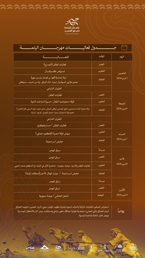 ويأتي المهرجان بتنظيم من اللجنة المنظمة لسباق الهجن، ضمن الجهود الرامية إلى الحفاظ على الموروث الشعبي الأصيل، وإبراز مكانة الهجن في تاريخ المملكة، إلى جانب دعم ملاك الهجن وتشجيع المشاركين، في أجواء تنافسية تعكس أصالة هذه الرياضة العريقة وعمق ارتباطها بالهوية الوطنية.