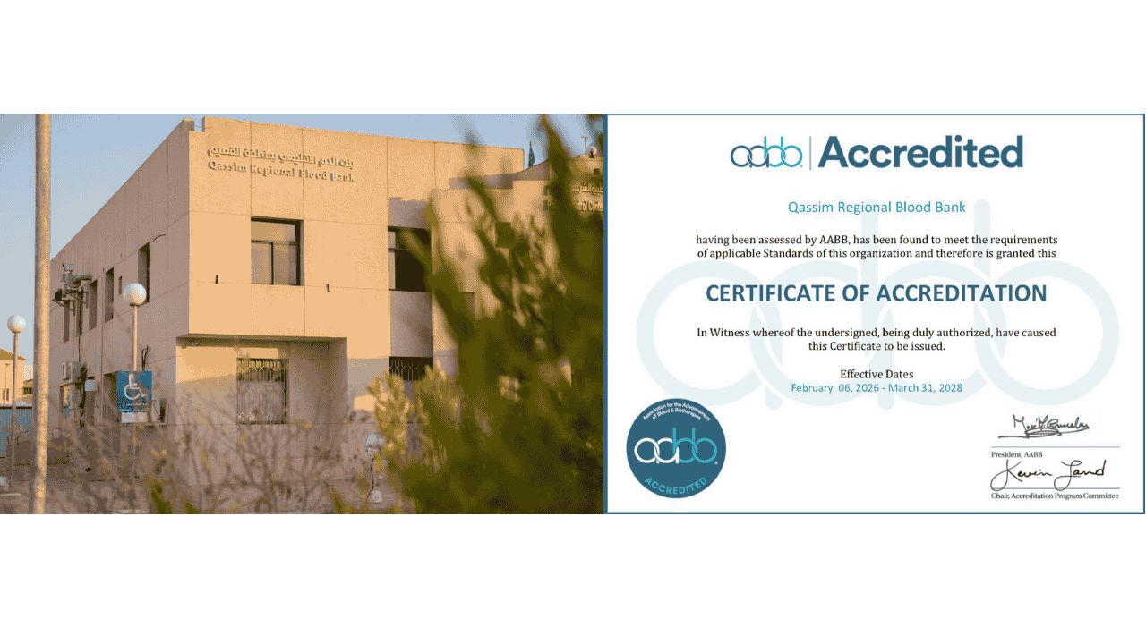 بنك الدم الإقليمي بالقصيم يحصل على اعتماد الجمعية الأمريكية لبنوك الدم (AABB)