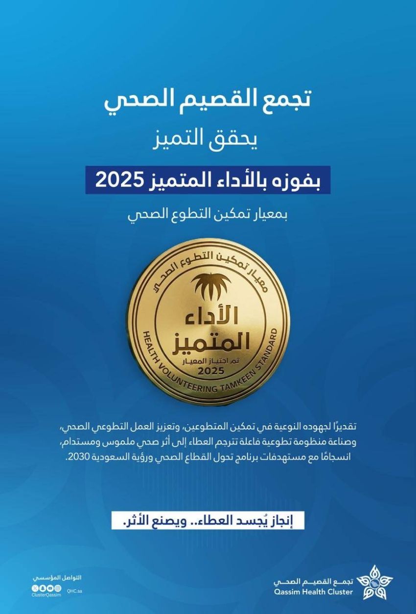 وأوضح تجمع القصيم الصحي أن هذا الإنجاز يعكس مدى التزامه بتطبيق الممارسات الصحيحة في إدارة وتمكين التطوع الصحي، وبما يتوافق مع مستهدفات برنامج تحول القطاع الصحي، ويتواكب مع تطلعات رؤية المملكة 2030 في تعزيز العمل التطوعي ورفع أثره المجتمعي.