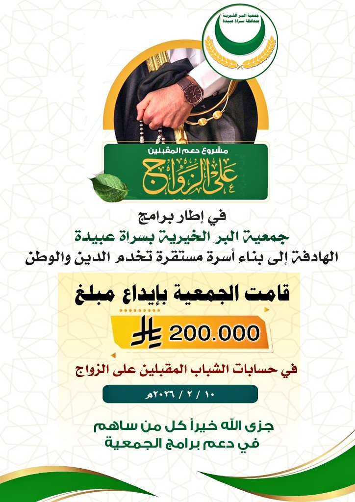 دعمت جمعية البر الخيرية بمحافظة سراة عبيدة برامجها الاجتماعية بإيداع مبلغ 200 ألف ريال في حسابات الشباب المقبلين على الزواج ضمن مشروع دعم الزواج وذلك في إطار جهودها الرامية إلى الإسهام في بناء أسر مستقرة تخدم الدين والوطن.