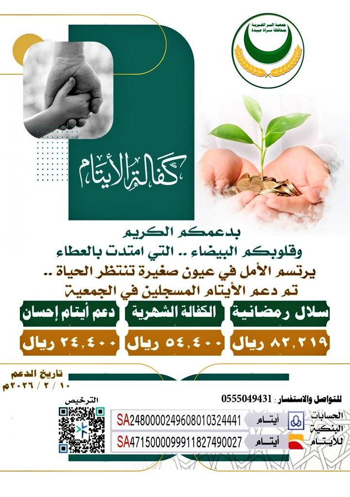 وأكد رئيس مجلس إدارة جمعية البر الخيرية بمحافظة سراة عبيدة الأستاذ مبارك بن شايع أن هذا الدعم يأتي امتدادًا لرسالة الجمعية في تمكين الأسر ودعم الشباب مشيرًا إلى أن الجمعية تواصل تنفيذ برامجها الخيرية وفق خطط مدروسة تحقق الأثر الاجتماعي المستدام إلى جانب برامج كفالة الأيتام التي تنفذها الجمعية وتشمل الكفالة الشهرية بقيمة 540 ريالًا ودعم الأيتام إحسان بقيمة 2,440 ريالًا إضافة إلى توزيع سلال رمضانية بقيمة 82,319 ريالًا دعمًا للأيتام المسجلين لدى الجمعية وتخفيفًا للأعباء المعيشية عن أسرهم.