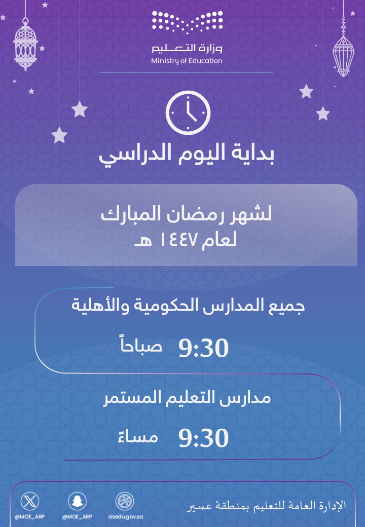 أعلنت الإدارة العامة للتعليم بمنطقة عسير، مواعيد بداية اليوم الدراسي خلال شهر رمضان المبارك لعام 1447هـ، وذلك لجميع المدارس الحكومية والأهلية ومدارس التعليم المستمر بالمنطقة.