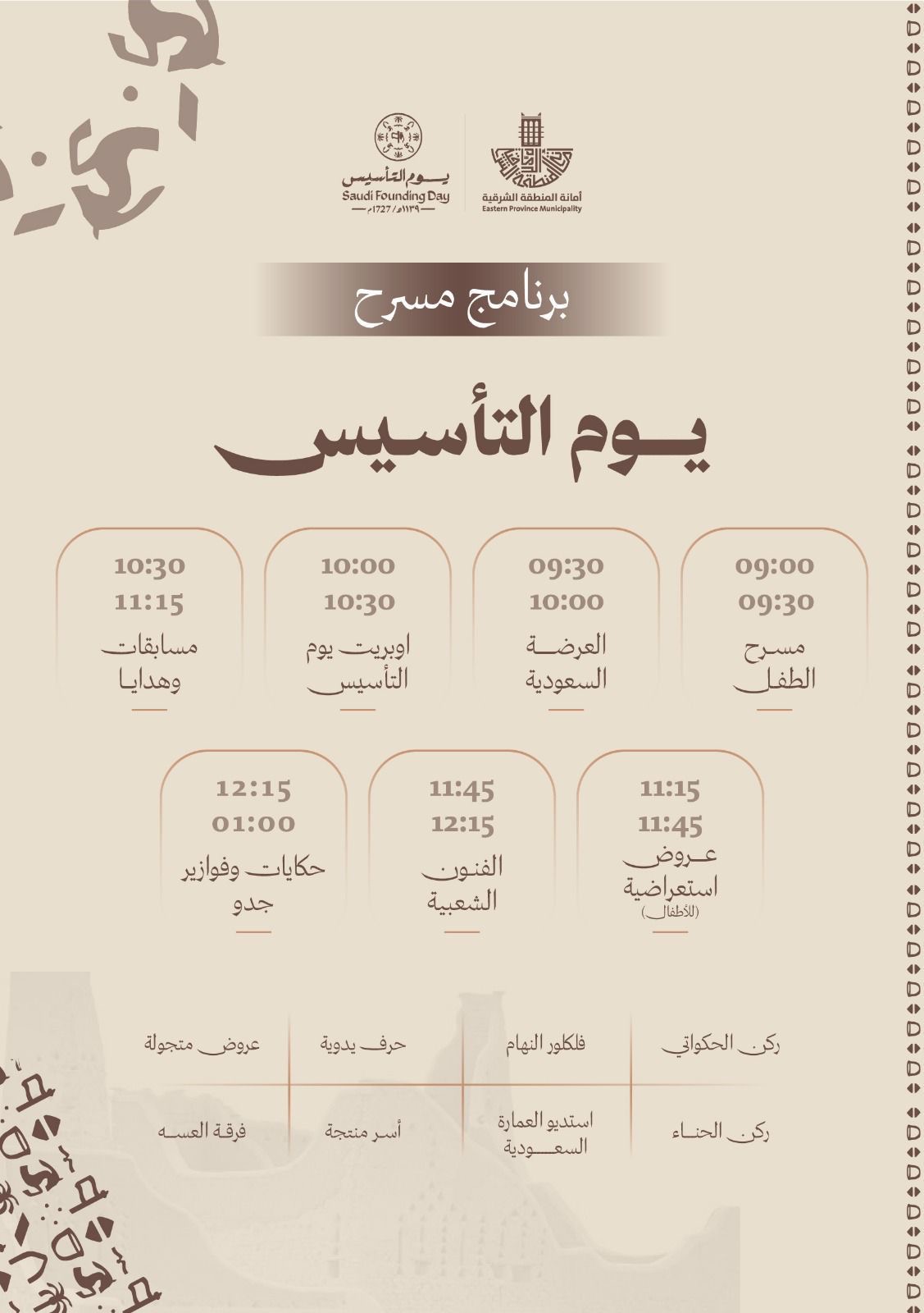 ويأتي برنامج يوم التأسيس بهوية وطنية تعبّر عن رمزية المناسبة، حيث يتضمن العرضة السعودية، وأوبريت يوم التأسيس، ومسرح الطفل، والعروض الاستعراضية، والفنون الشعبية، إلى جانب مسابقات وهدايا وحكايات وفوازير، إضافة إلى أركان ثقافية وتراثية، تشمل ركن الحكواتي، وركن الحناء، وفلكلور النهّام، واستديو العمارة السعودية، والحرف اليدوية، والعروض المتجولة، بما يعزز ارتباط الأجيال بتاريخهم الوطني ويجسد قيم الانتماء والفخر بالهوية السعودية.
