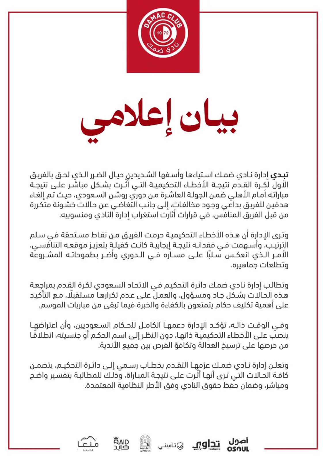 وطالبت إدارة النادي دائرة التحكيم في الاتحاد السعودي لكرة القدم بمراجعة الحالات التحكيمية محل الجدل بشكل عاجل ومسؤول، والعمل على عدم تكرار مثل هذه الأخطاء خلال الجولات المقبلة، مع التأكيد على أهمية إسناد المباريات لحكام يتمتعون بالكفاءة والخبرة.