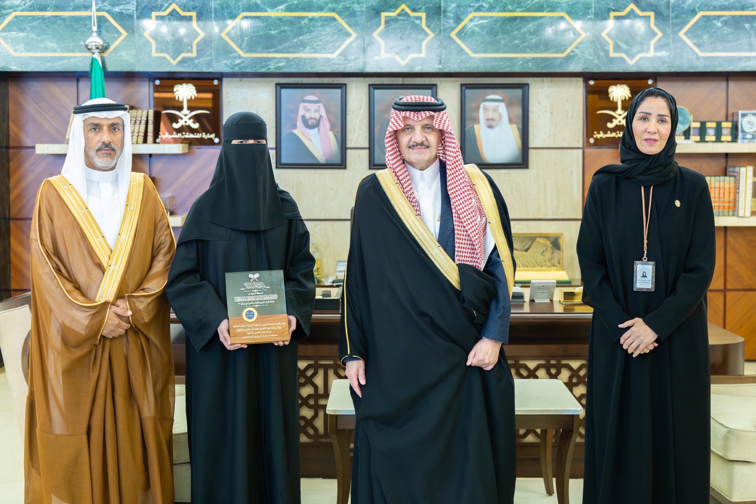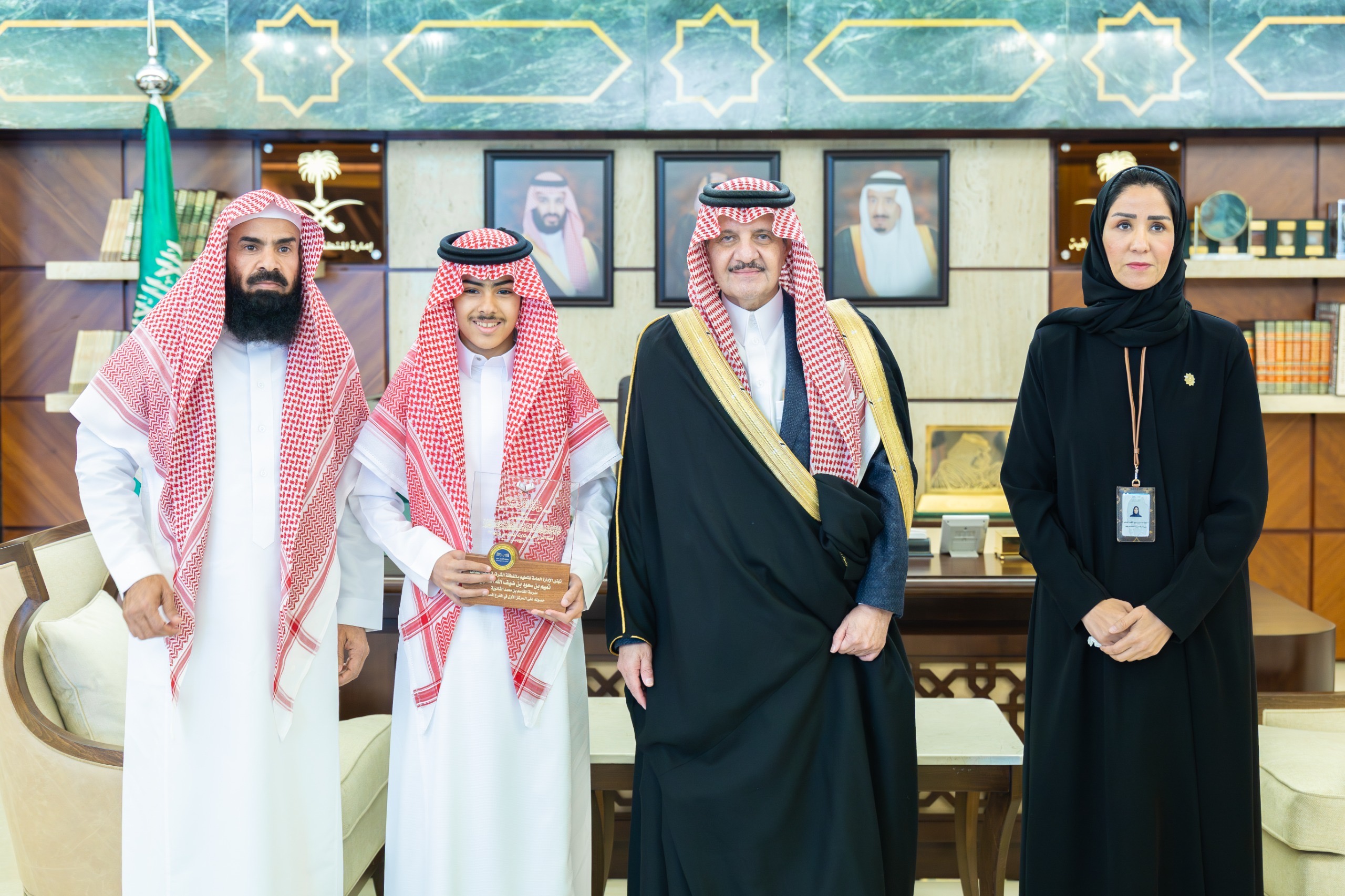 استقبل صاحب السمو الملكي الأمير سعود بن نايف بن عبدالعزيز أمير المنطقة الشرقية، في مكتب سموه بديوان الإمارة اليوم الثلاثاء، الطالب تميم بن سعود العنزي والطالبة بيان بنت عبدالله باعقيل الفائزين في المسابقة المحلية على جائزة خادم الحرمين الشريفين الملك سلمان بن عبدالعزيز لحفظ القرآن الكريم وتلاوته وتفسيره في دورتها الـ27، حيث كرّم سموه الفائزين تقديراً لتميّزهما في حفظ كتاب الله الكريم، بحضور مدير عام التعليم بالمنطقة الشرقية الدكتورة منيرة بنت بدر المهاشير.