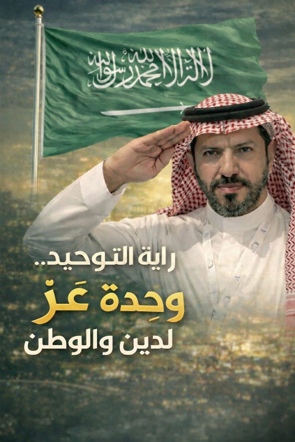كلمة التوحيد فخر ورفعة . يظل العلم مرفوعاً شامخاً، وشعب شامخ لا ينحني امام التحديات، حاملًا رسالة التوحيد وراية وحدة المملكة تحت شعار كلمة التوحيد : “لا إله إلا الله محمد رسول الله”، شاهدة على القيم الراسخة التي تجمع هذا الوطن.
