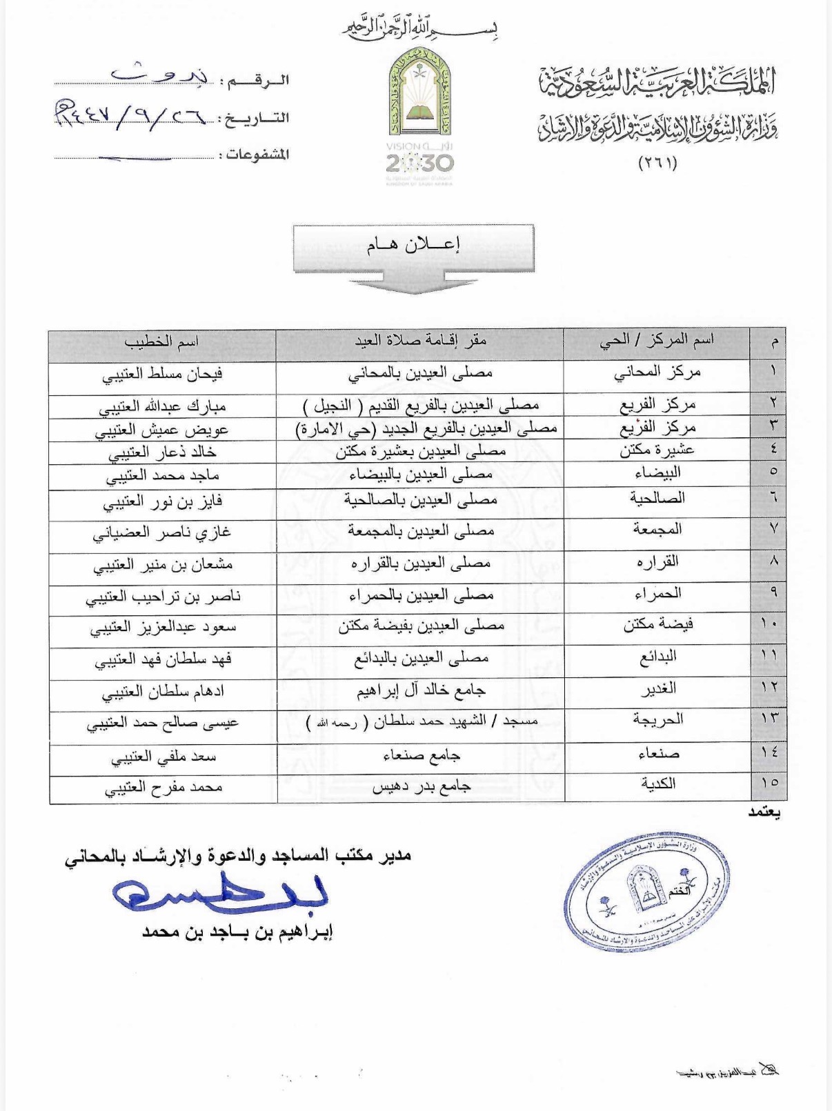 اعتماد 15 مصلى لصلاة عيد الفطر في المحاني والفريع