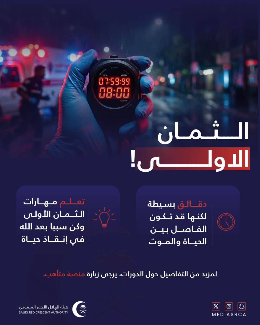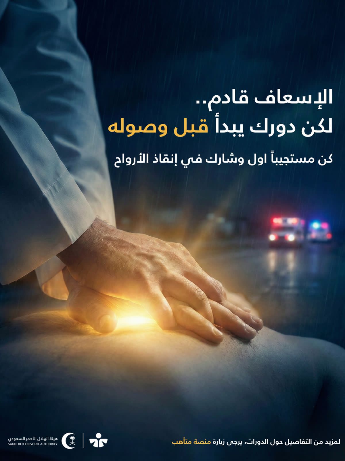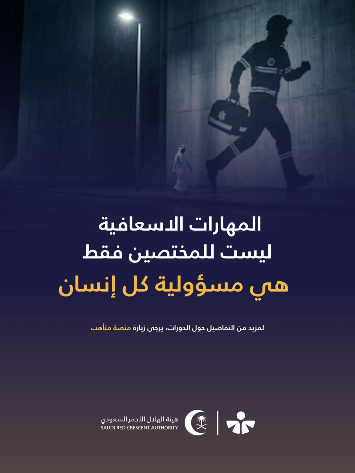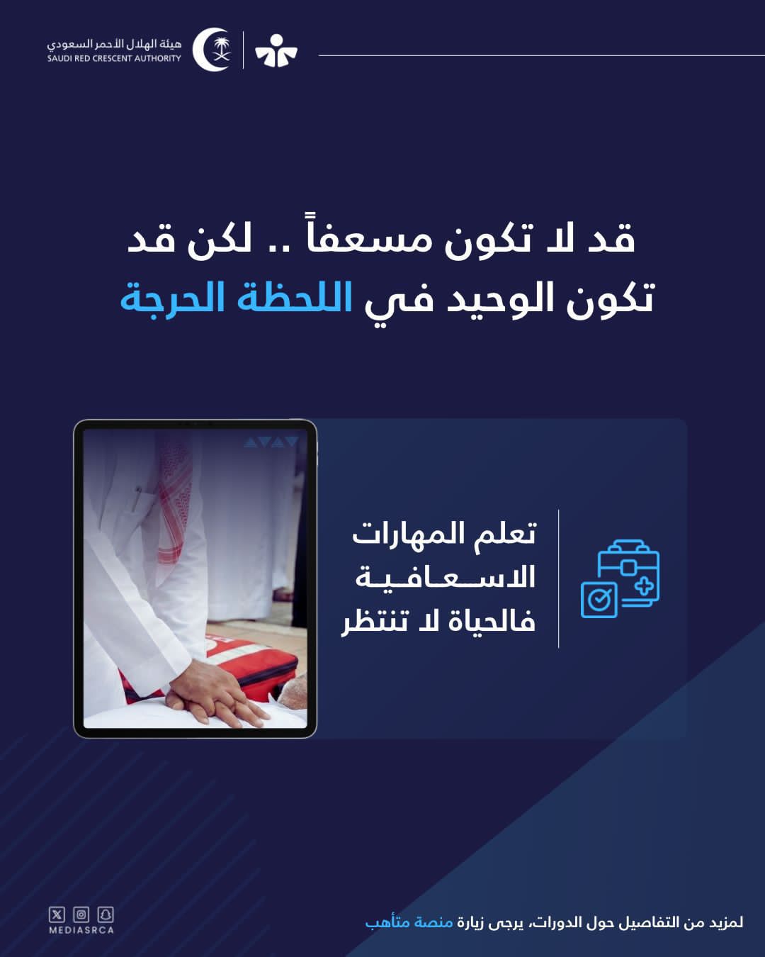وأشار إلى أن نشر الوعي بالإسعافات الأولية وتمكين أفراد المجتمع من أساسياتها يعزز من جاهزية المجتمع لمواجهة الطوارئ، ويرفع من فرص النجاة ويحد من المضاعفات الناتجة عن التأخر في تقديم المساعدة.