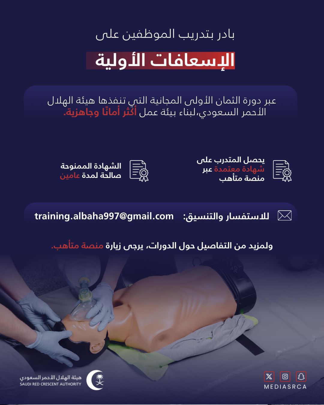 فرع الهلال الأحمر بالباحة يدعو المجتمع لتعلم الإسعافات الأولية مهارات تنقذ الأرواح في اللحظات الحرجة
